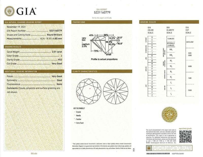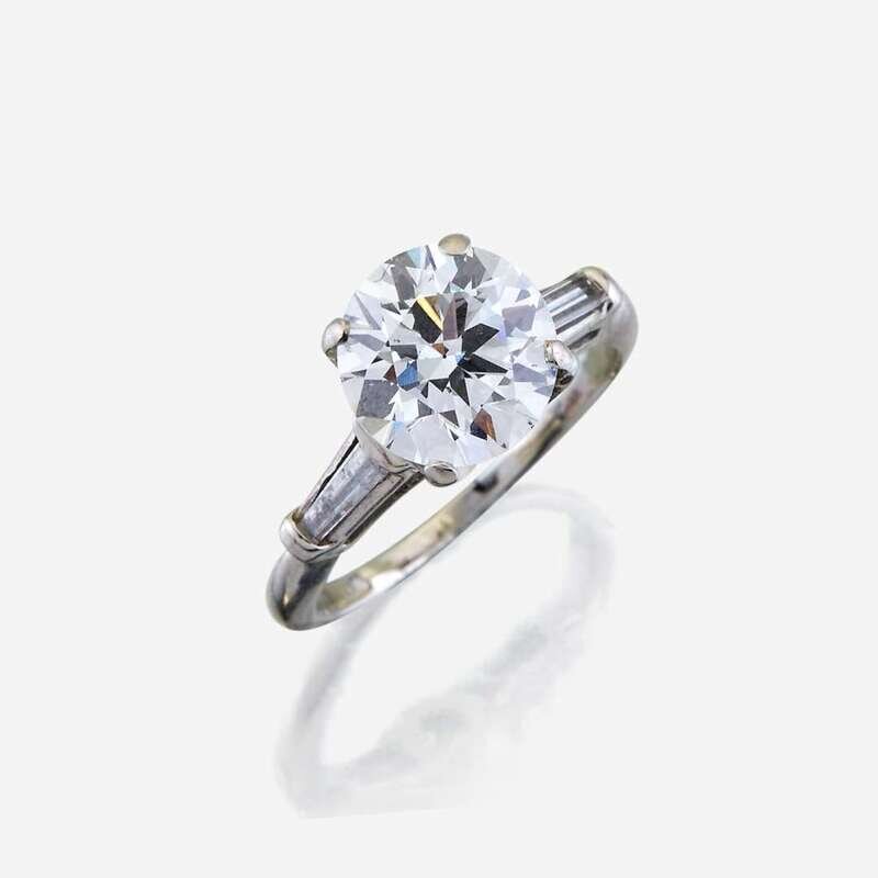 centering an old European-cut diamond weighing 2.01 carats, flanked by tapered baguette-cut diamonds, mounted in 18K white gold prongs and white metal shank.