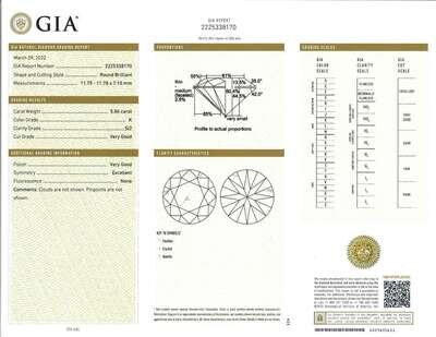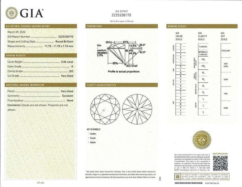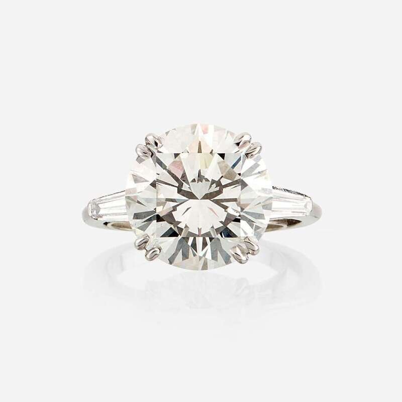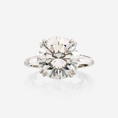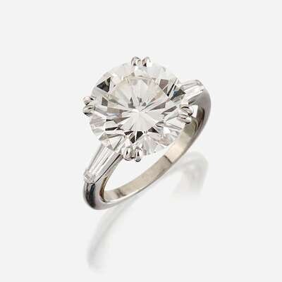 centering a round brilliant-cut diamond weighing 5.86 carats, flanked by tapered baguette-cut diamonds, mounted in platinum.