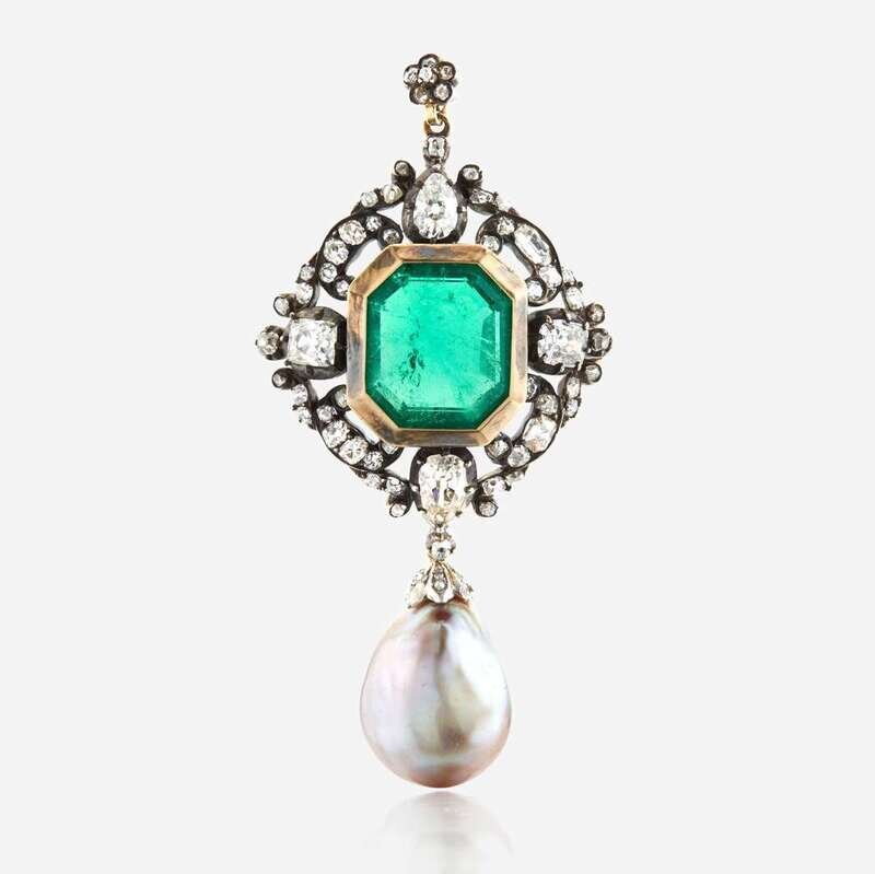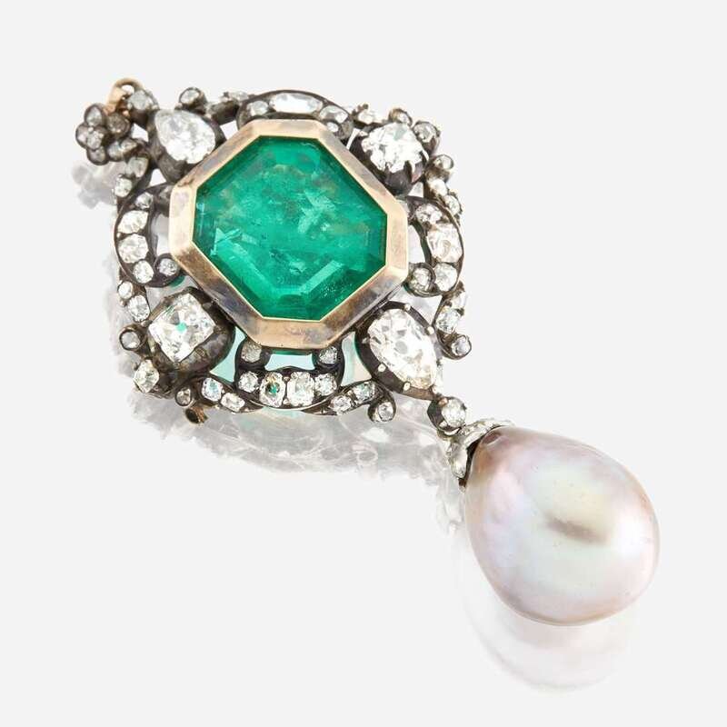 A Victorian emerald, diamond, pearl, and silver topped gold pendant/brooch