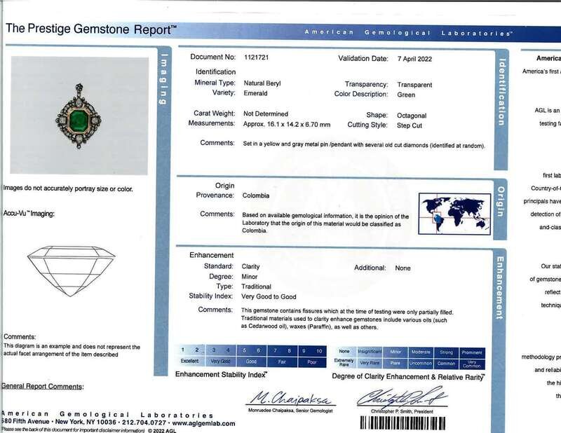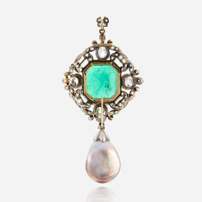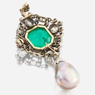 centering a 14K gold bezel-set octagonal-cut emerald weighing approximately 10.50 carats, accented by old pear shaped and old mine-cut diamonds, suspending a baroque black natural saltwater pearl; estimated total diamond weight: 4.15 carats, in silver topped 14K gold.