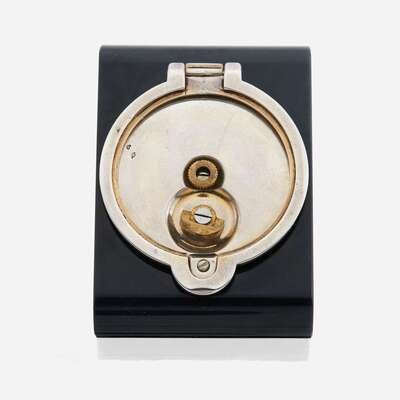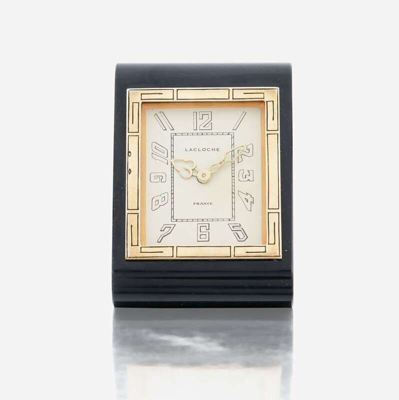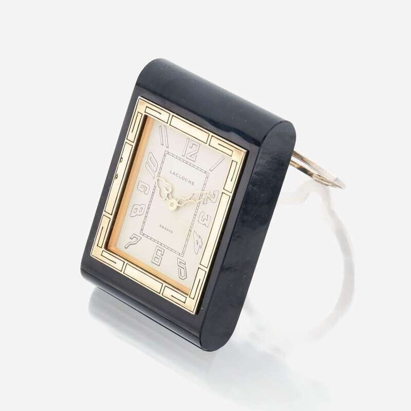 Lacloche Miniature Traveling Desk Clock and Case, c. 1940, deep blue/gray agate case with line engraved brass dial surround, arabic numeral dial signed "Lacloche," pierced silver hands and hinged rear rest, housed in a green-leather fitted case with strap marked in gilt "Maquet, Paris-Nige," ht. 2 1/2 in.
