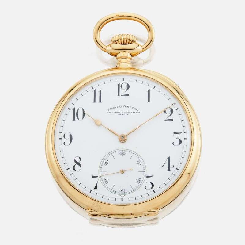 18K, a Chronometer Royal manual wind pocket watch, openface white dial, black arabic numbers, seconds subdial, and gold hands, signed Vacheron & Constantin Geneve case.