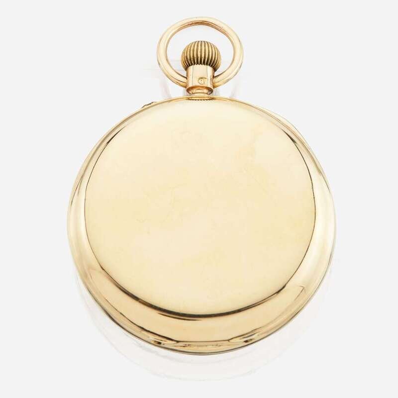 18K, Bahne Bonniksen "Non-Magnetic" No. 62873 Pocket Chronometer with 52 1/2-minute Karrusel Regulator, c. 1897, white enamel radial roman numeral dial with outer minute track, sunk subsidiary seconds, blued-steel spade hands, three-quarter-plate, 15-jewel movement with going barrel, pointed tooth lateral lever escapement, cut bimetallic balance with gold timing screws, palladium balance spring with terminal curve, index regulation, ruby endstone, Bonniksen 52 1/2-minute Karrusel regulator, stamped with the Bahne Bonniksen patent mark on the pillar plate, movement and case marked "62873," dia. 55 mm.
