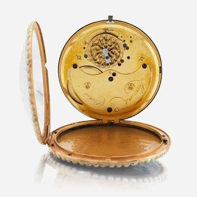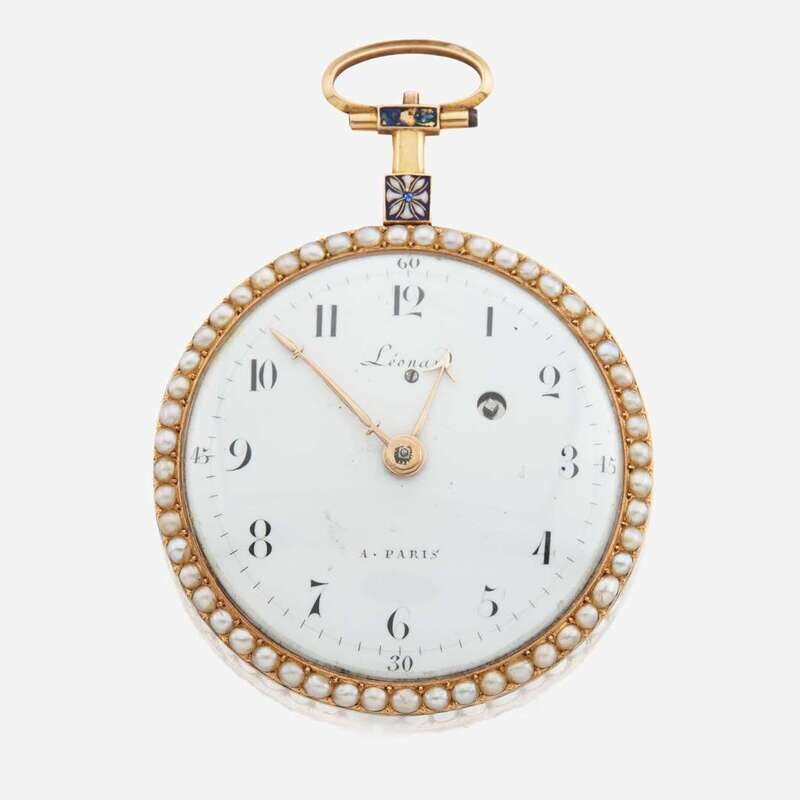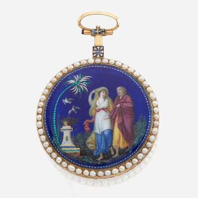 18K, mechanical key wind movement in a blue guilloche enameled case by Leonard, Paris. Porcelain dial, with arabic numbers. The case rim is set with split-pearls, the back is decorated with an enameled scene of biblical man and woman on the back. Accompanied by its winding key.