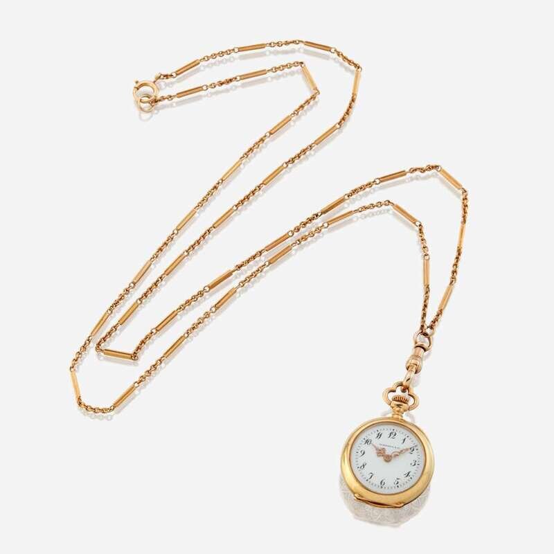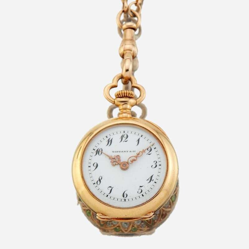 18K, jeweled manual wind swiss movement, white porcelain dial marked Tiffany & Co., arabic numbers, Louis XIV hands, the movement is marked " Tiffany & Co. New York" No.13127, the back cover is gem-set with tsavorite garnets and diamonds in a star pattern diamond. The pocket watch is suspended from a 25" bar link chain with a spring clasp attached to the clover stylized bow. Estimated total diamond weight: 1.00 carat
