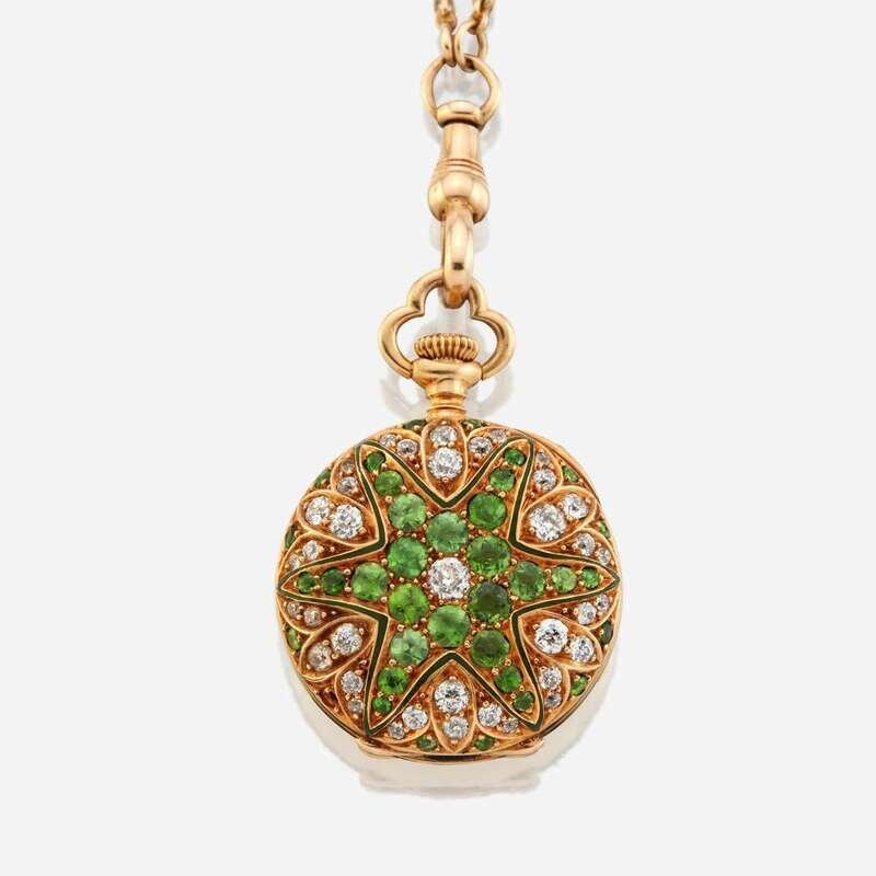 A lady's diamond and tsavorite garnet openface pocket watch necklace, Tiffany & Company