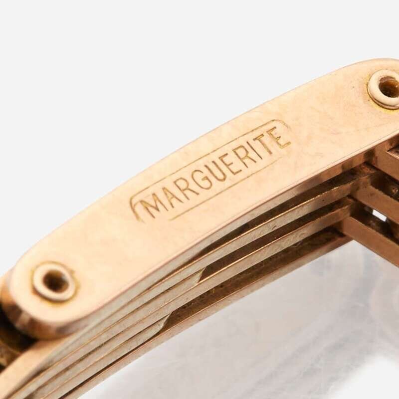 15K/18K, Swiss made mechanical manual wind movement, cased in an eighteen karat round gold case, white dial, arabic numbers and applied gold dots. 13 round diamonds and 13 round green diamantoid garnet stones, decorated bezel, the expandable bracelet is marked 15ct, engraved cuvette, monogrammed cover.