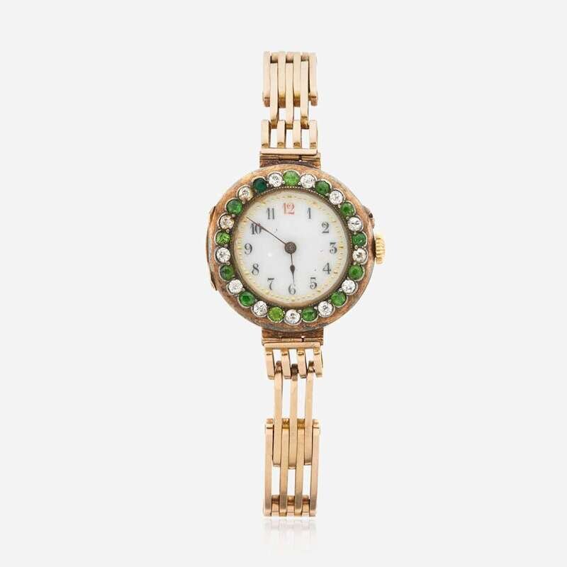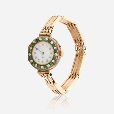 A gold, diamond, and green stone bracelet watch, Swiss C.1909