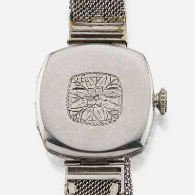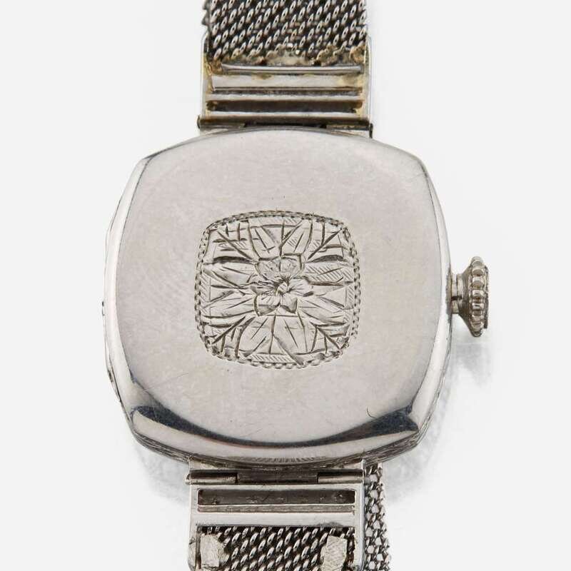 A 18J swiss cresarrow W & Co. manual wind mechanical movement, arabic number markers, cased in a diamond framed platinum case, hand etched floral details, integrated adjustable mesh bracelet, marked platinum. Estimated total diamond weight: 0.70 carats