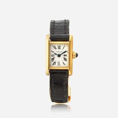17 jewel movement, calibre 845 be LeCoultre and Co., case number 61325, 18K gold case and white dial with roman numerals and synthetic sapphire set crown. Completed by a leather strap and 18K gold Cartier deployment buckle.