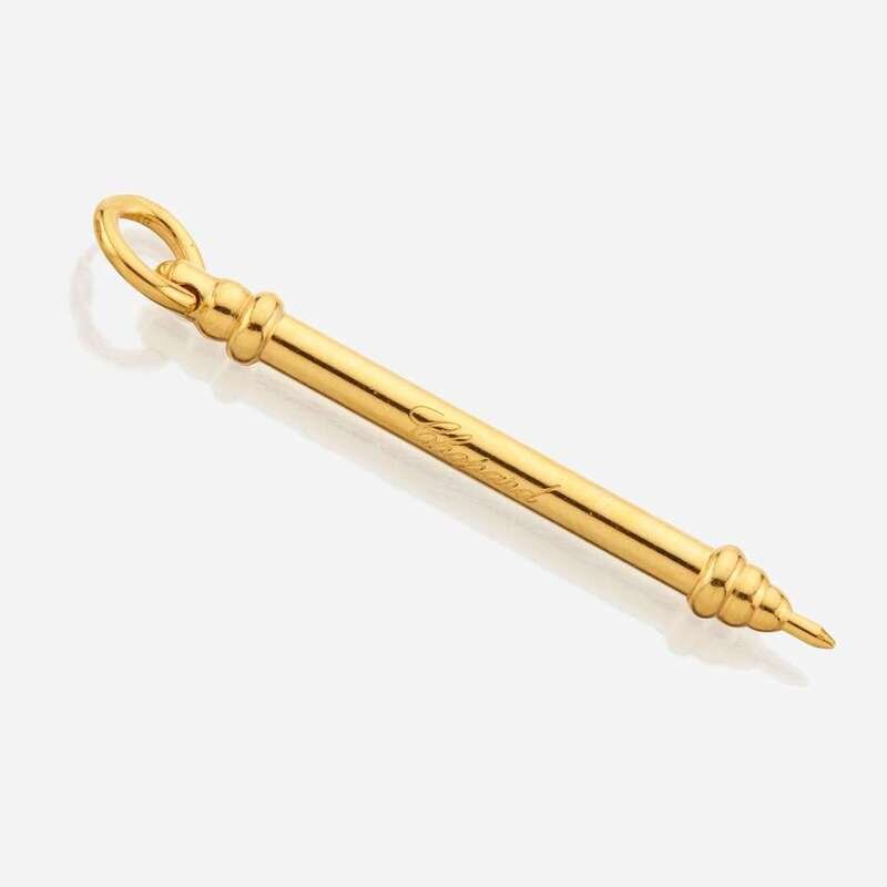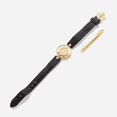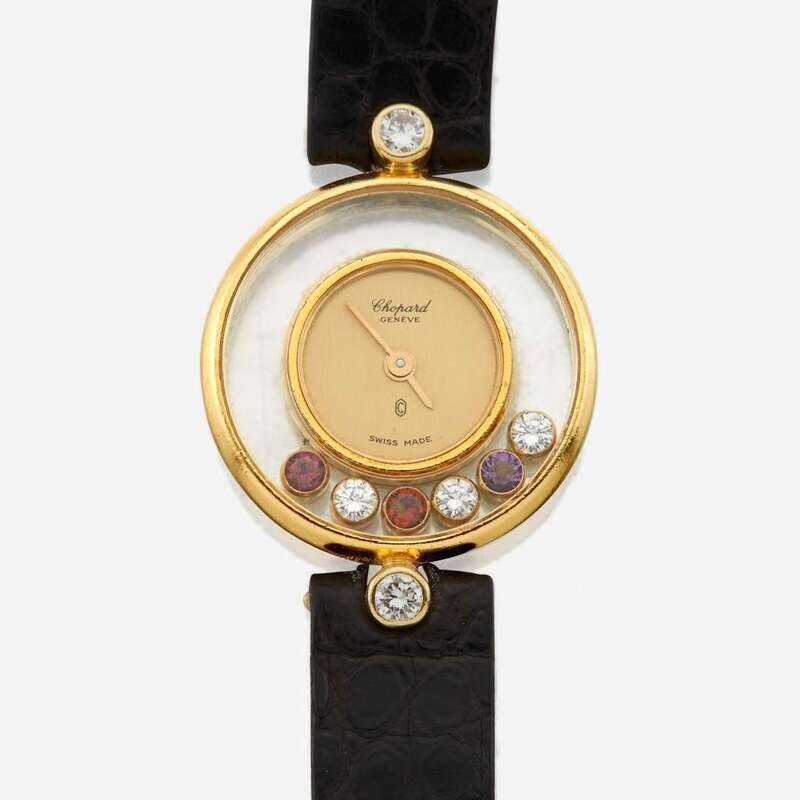 18K, quartz watch, champagne dial, leather bracelet, eighteen karat gold buckle, two each bezel set diamonds set north and south of the round dial. Six floating bezel set diamonds and gemstones. Estimated total diamond weight: 0.24 carats.