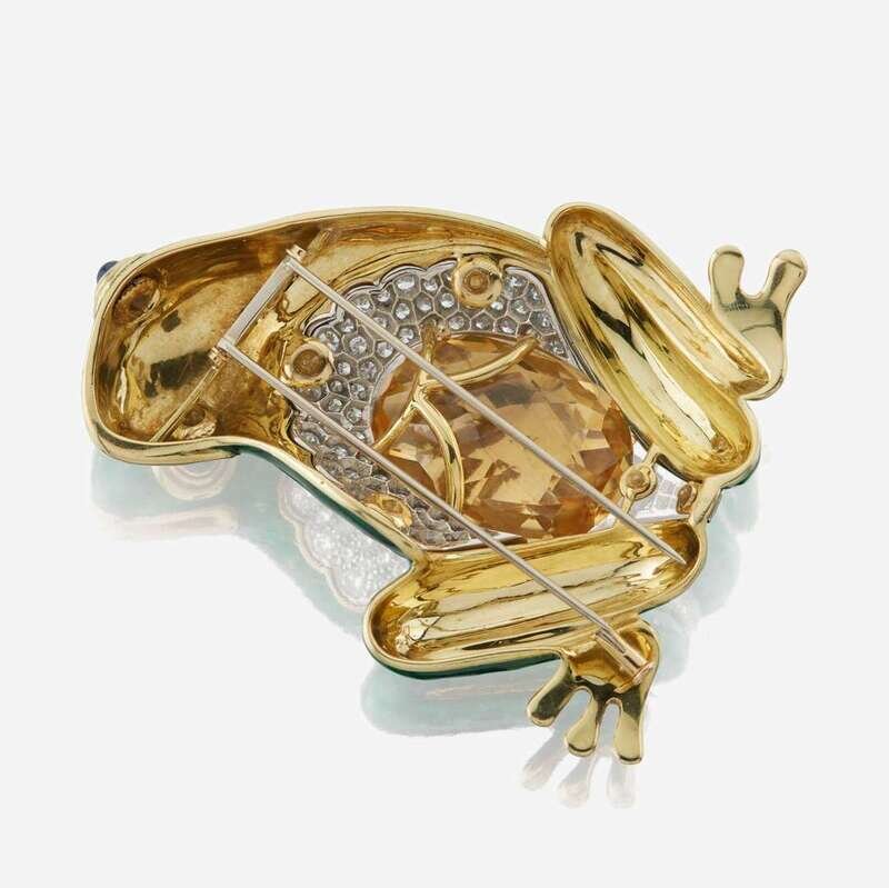 designed as an 18K green enameled frog with a large oval-cut citrine weighing approximately 53.2 carats, surrounded by multiple rows of round brilliant-cut diamonds and two cabochon sapphires for the eyes; estimated total diamond weight: 3.7 carats.