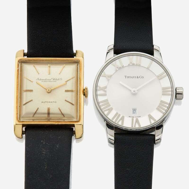 A Tiffany & Company Atlas watch, quartz, battery powered movement, roman numeral markers, date, round silver dial, black leather band, and a fourteen karat gold International Watch & Co. Schaffhausen, automatic mechanical movement, squared silver dial, and gold stick markers, with a black leather band.