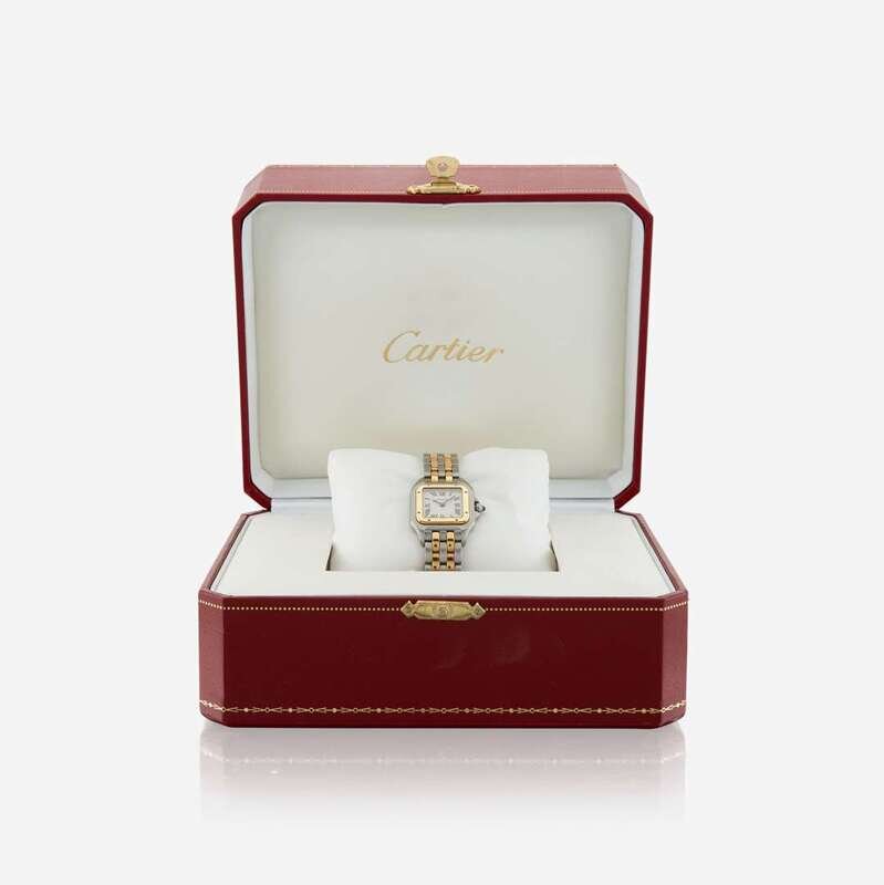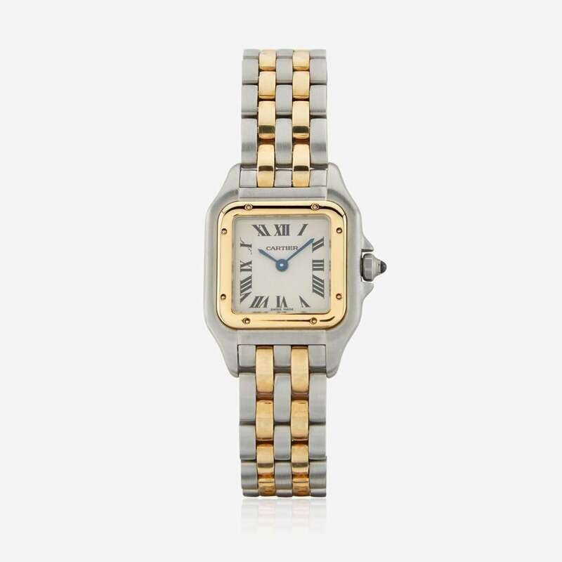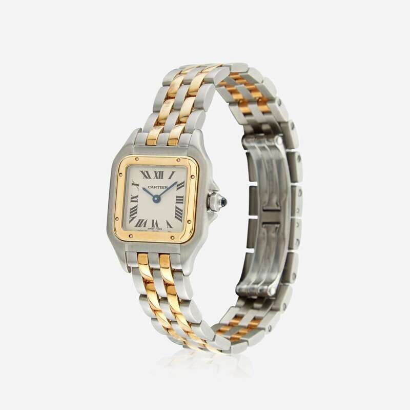 18K/SS, swiss made ladies Cartier Panthere watch with an eighteen-karat and stainless steel bicolor "double row" bracelet, hidden butterfly clasp, and 22mm stainless steel case with gold accents and roman numerals markers in the dial. Sapphire crystal, quartz battery powered movement.
