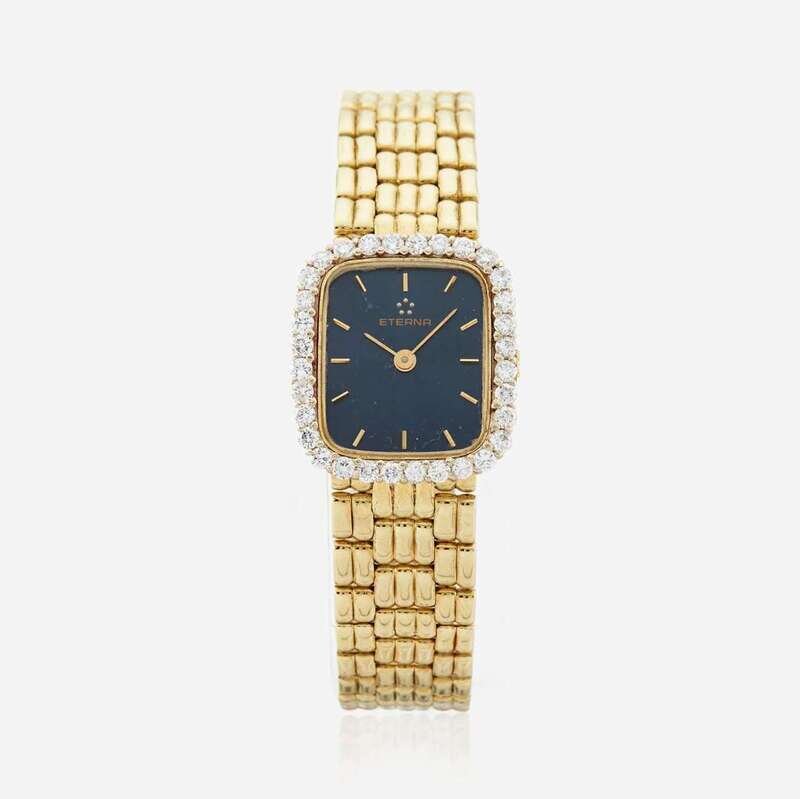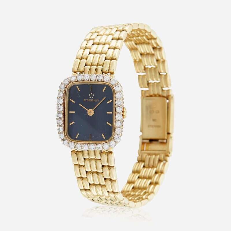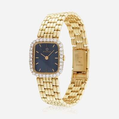 14K, quartz, battery operated movement, rectangular case with a blue dial framed by thirty-two round full-cut brilliant diamonds. Integrated flexible gold bracelet with a gold over clasp. Estimated total diamond weight 0.90 carats.