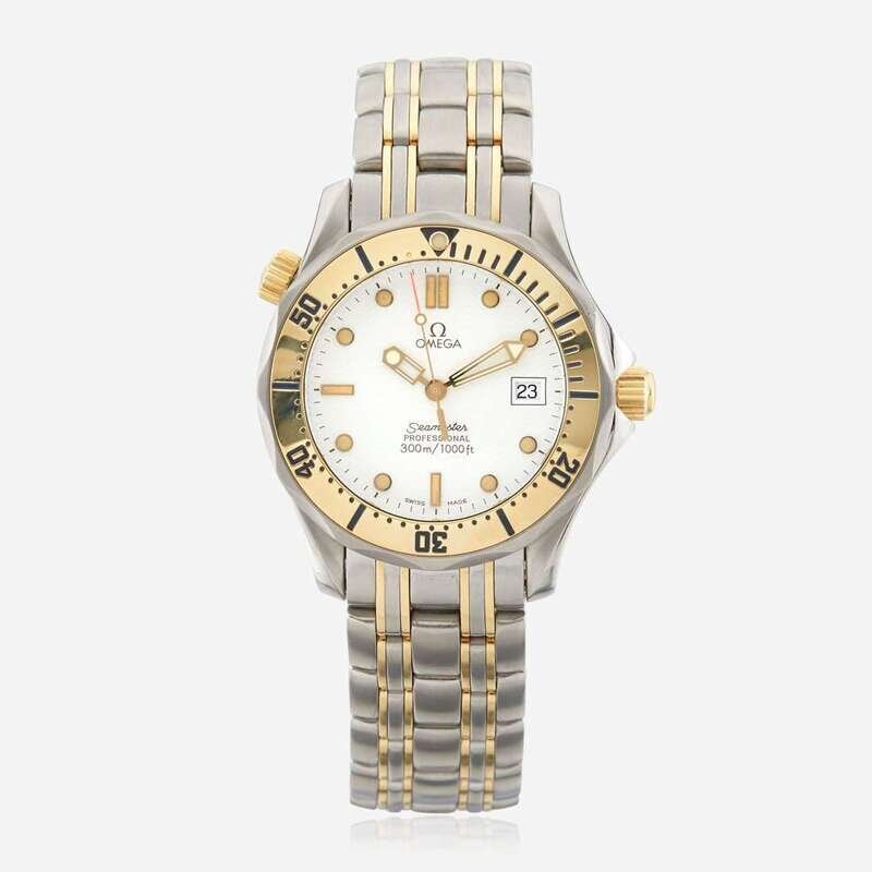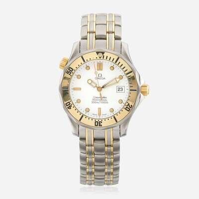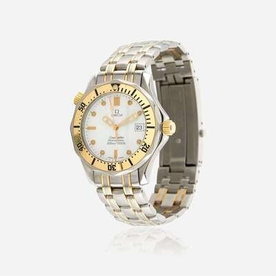 SS/18K, 300m/1000ft professional swiss divers watch, with a helium escape valve, white "wave" dial, and date complication. Eighteen karat gold bezel and screw down crown, sapphire crystal, complete with a fliplock clasp.