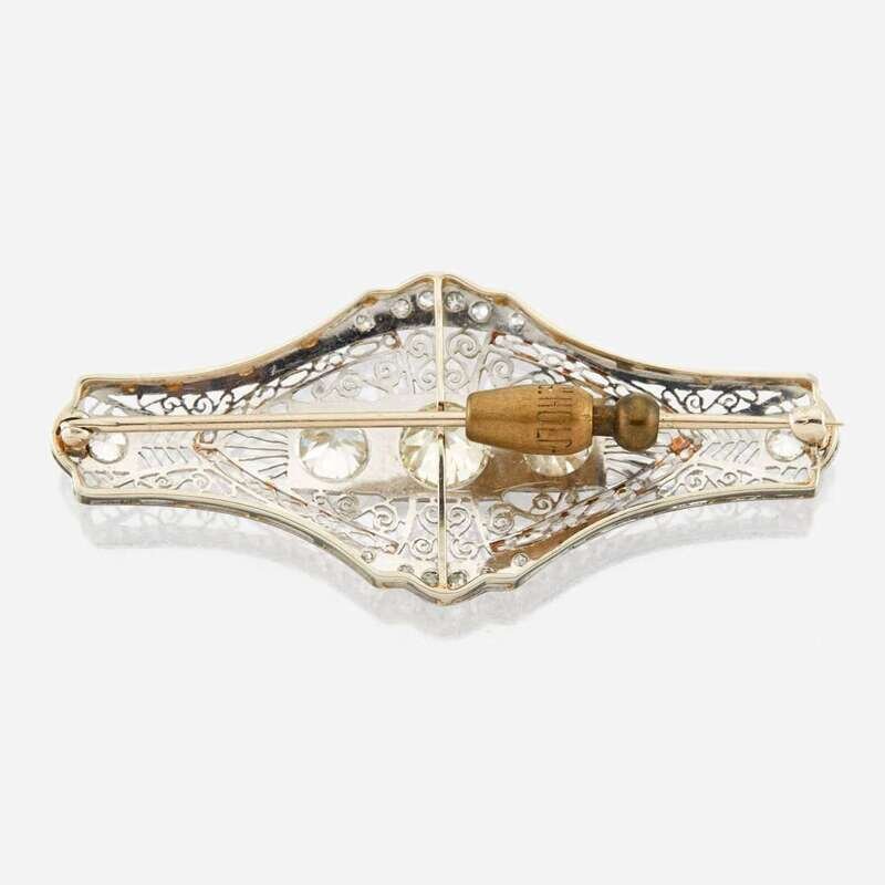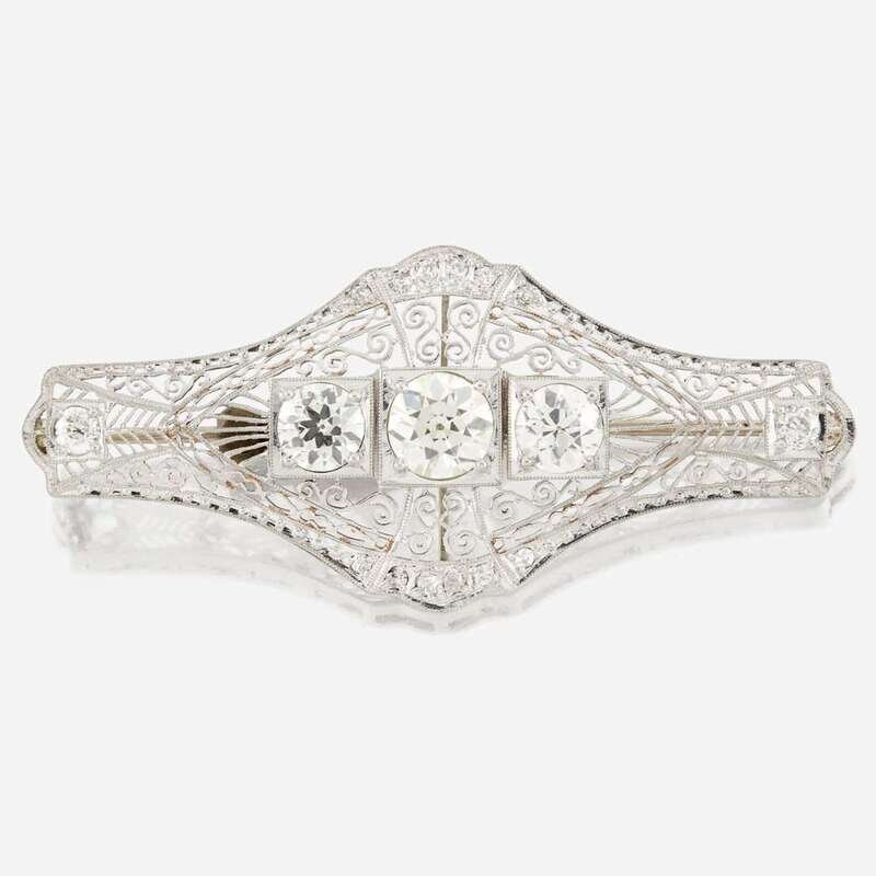 designed as openwork 18K white gold filigree centering three old European-cut diamonds weighing approximately 1.85, 1.00, and 1.00 carats each, accented by old mine-cut diamonds; estimated total remaining diamond weight: 0.55 carats.