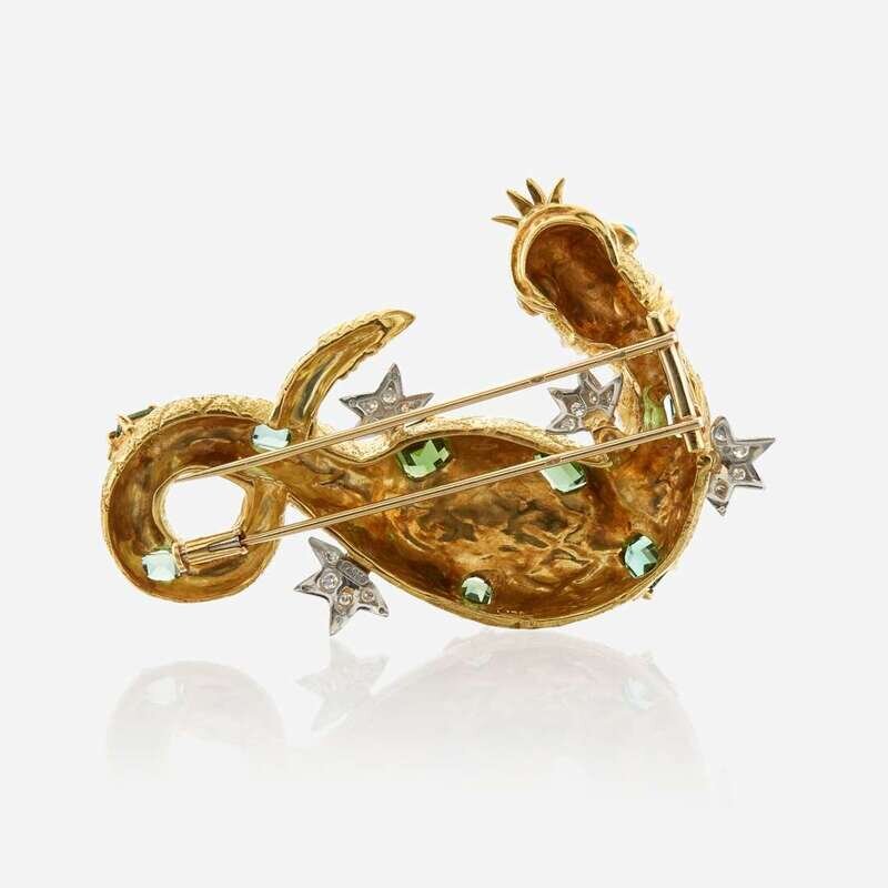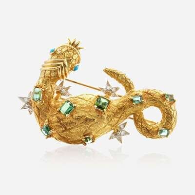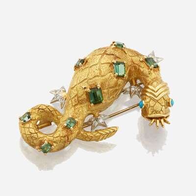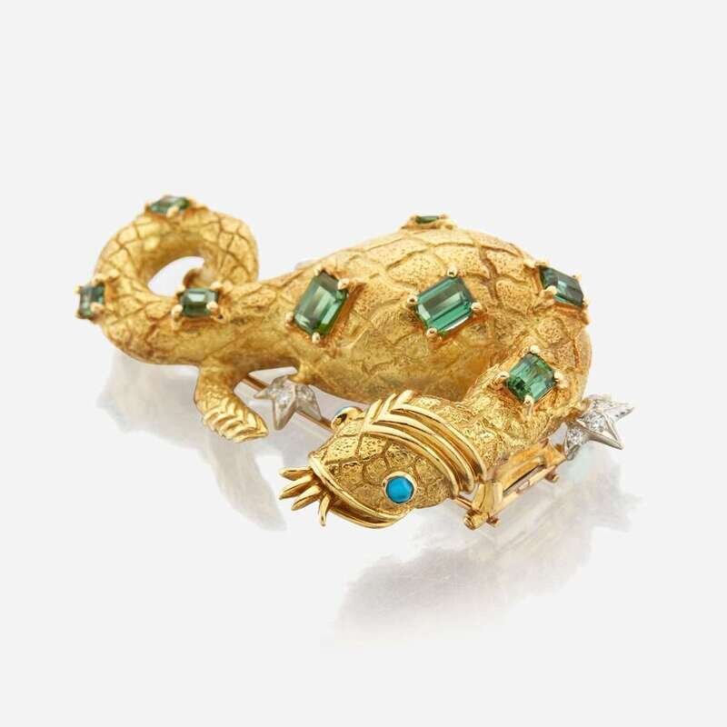designed as a textured 18K gold salamander set throughout with emerald-cut tourmalines, platinum dactyly set with round brilliant-cut diamonds, and turquoise cabochon eyes.