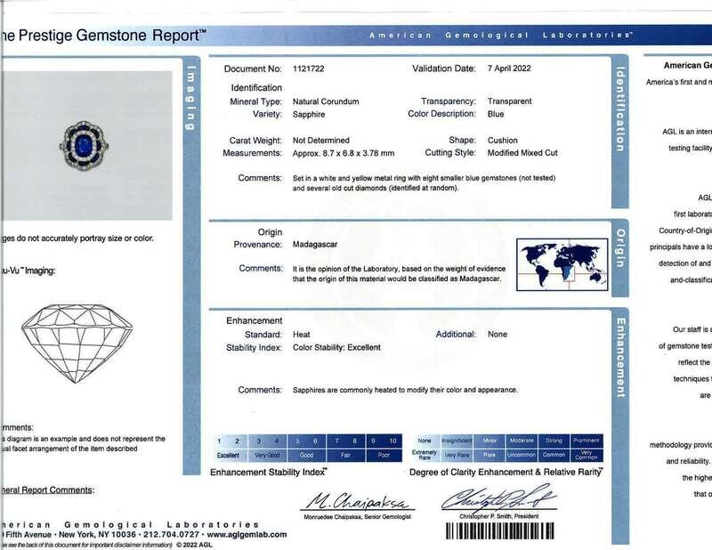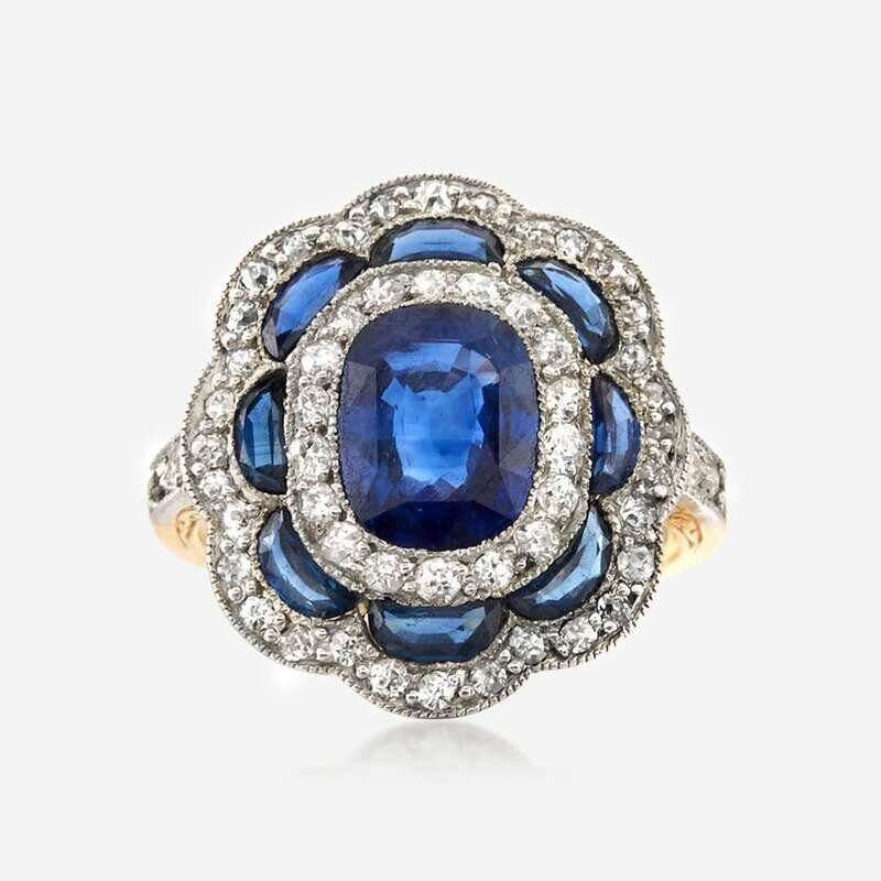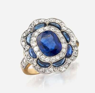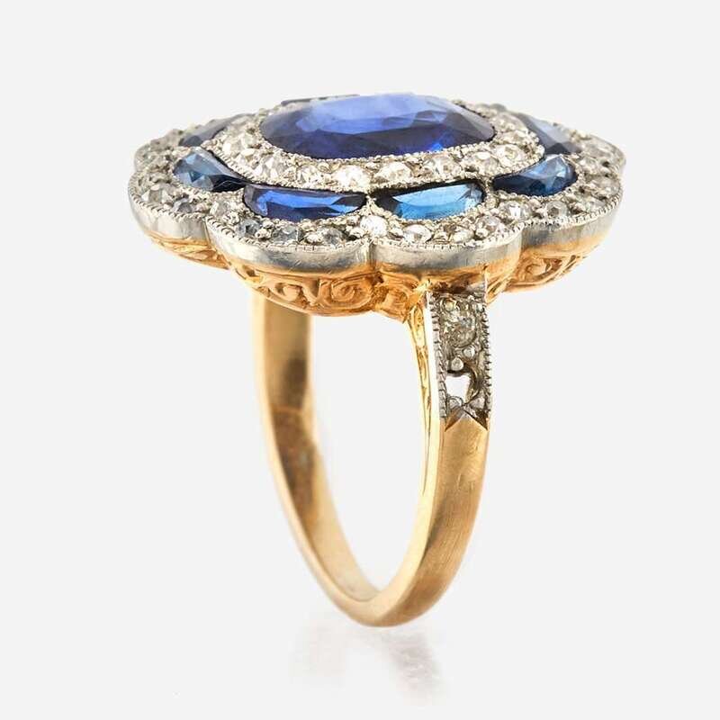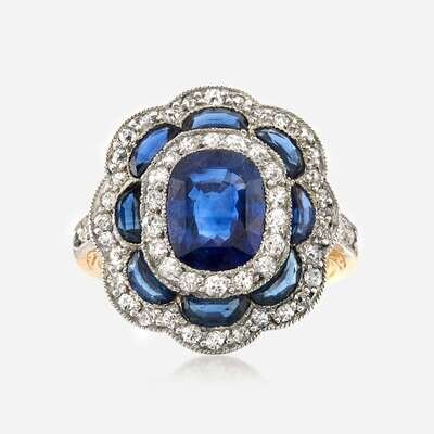 centering an oval-cut sapphire weighing approximately 1.75 carats, surrounded by old mine-cut diamonds and calibré-cut sapphires, mounted in platinum topped 18K gold.