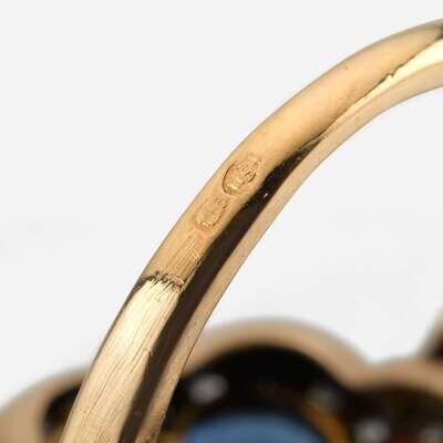 A sapphire, diamond, and platinum topped gold ring