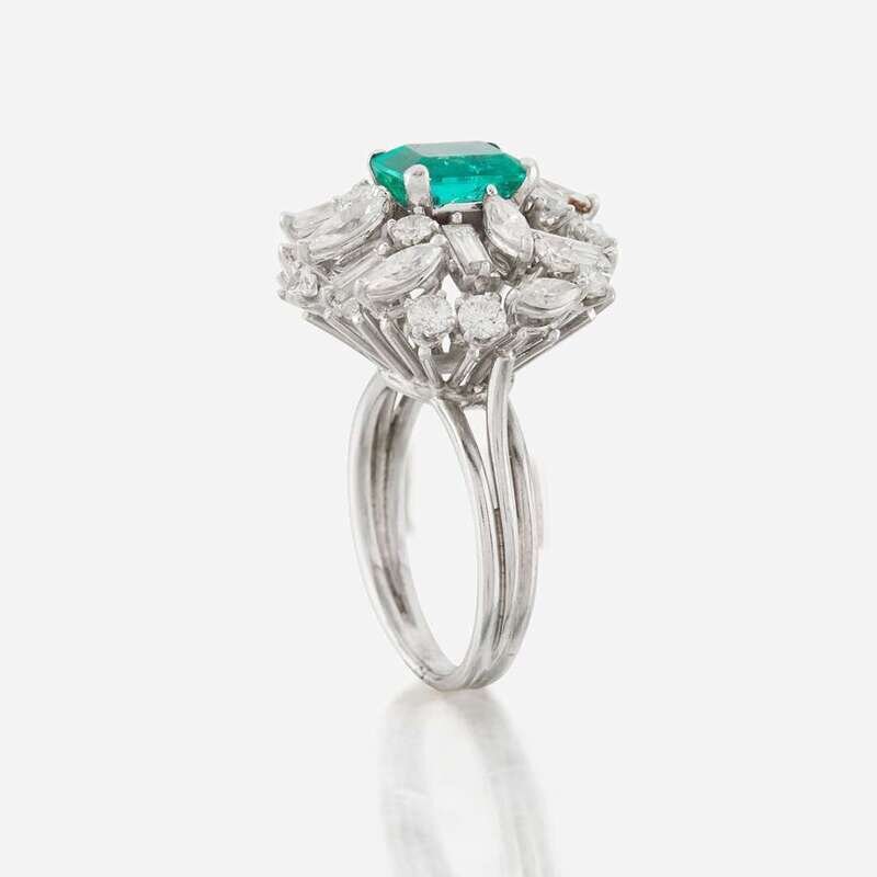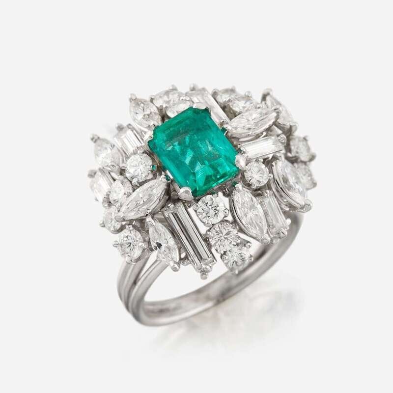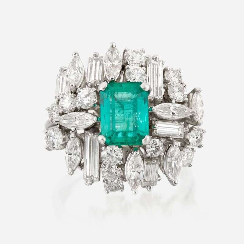 An emerald, diamond, and platinum ring