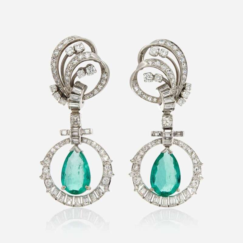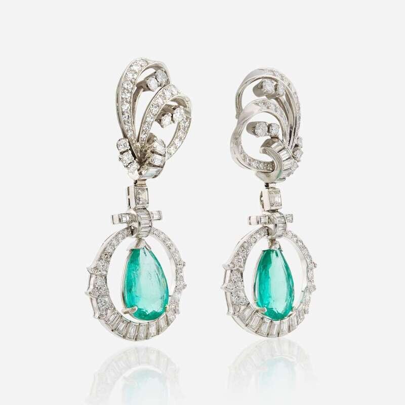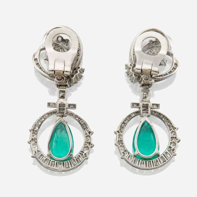 A pair of emerald, diamond, and platinum pendant ear clips, Mauboussin