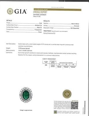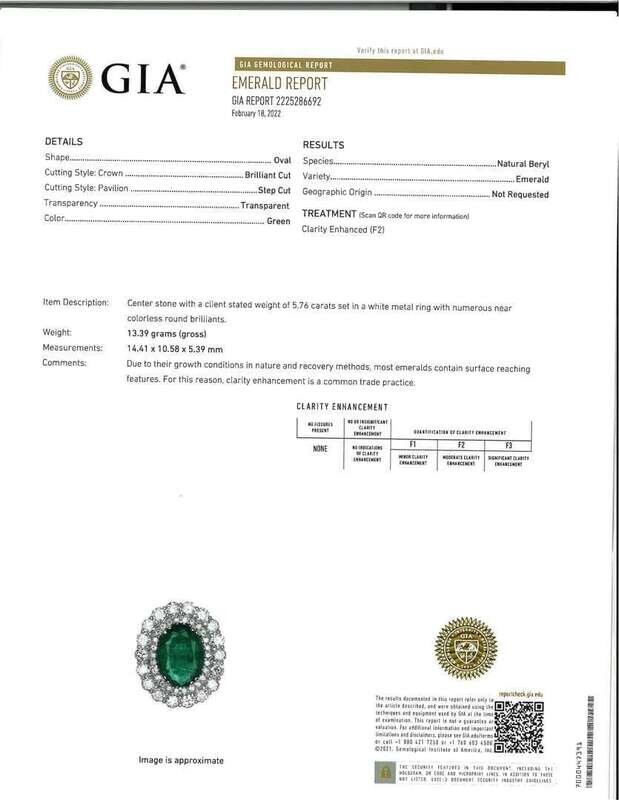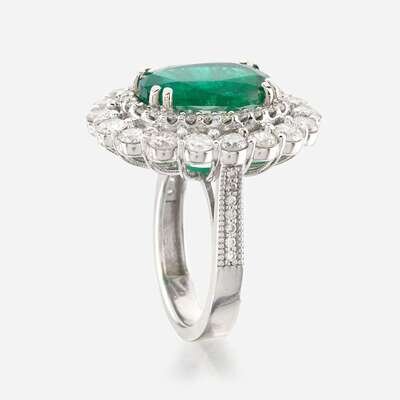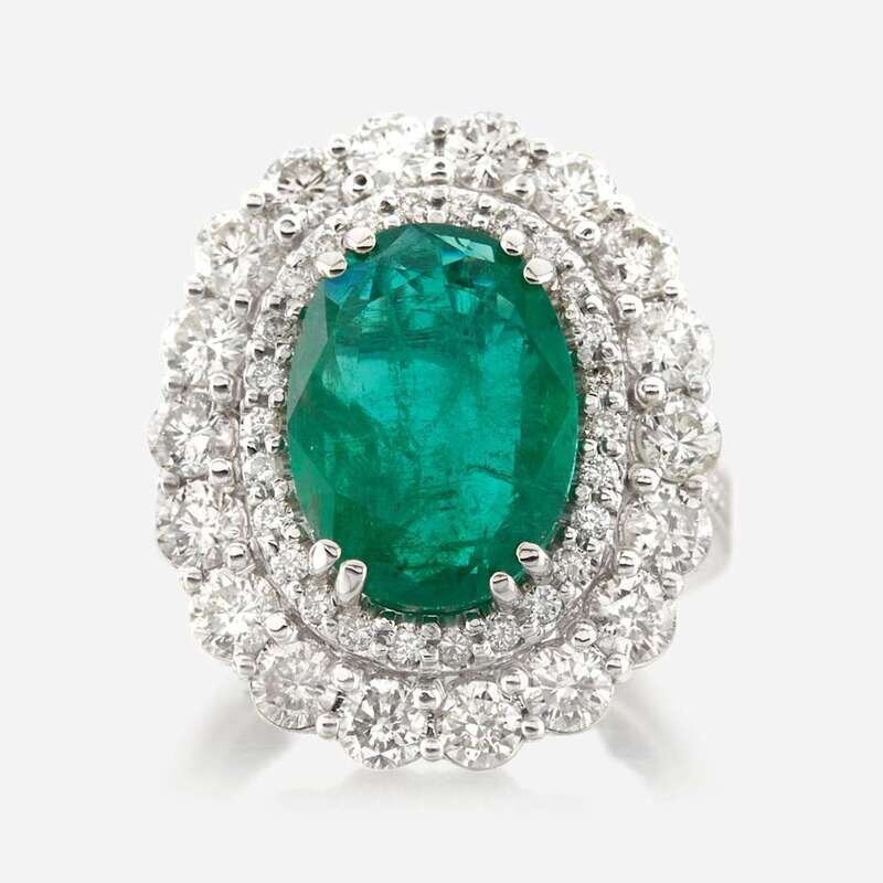 centering an oval-cut emerald weighing approximately 5.75 carats, surrounded by two rows of round brilliant-cut diamonds; estimated total diamond weight: 2.85 carats, mounted in 18K white gold.