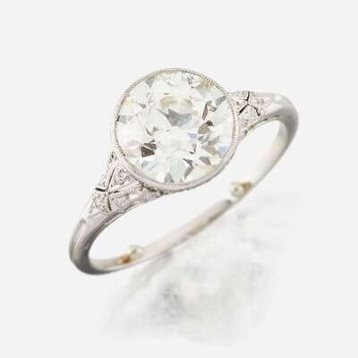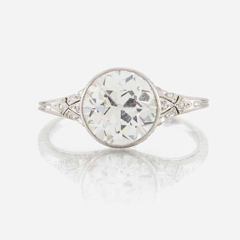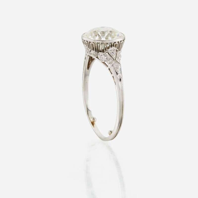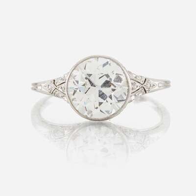 centering an old European-cut diamond weighing approximately 2.40 carats, accented by single-cut diamonds, mounted in pierced and millgrained platinum.