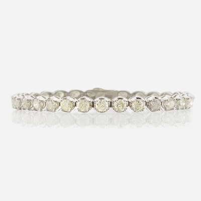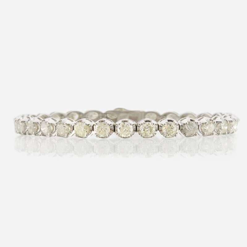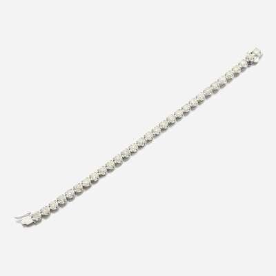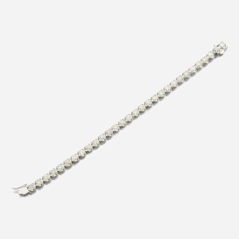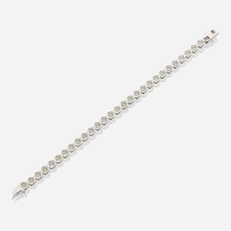 designed as a line set with round brilliant-cut diamonds; estimated total diamond weight: 9.60 carats, mounted in 14K white gold.