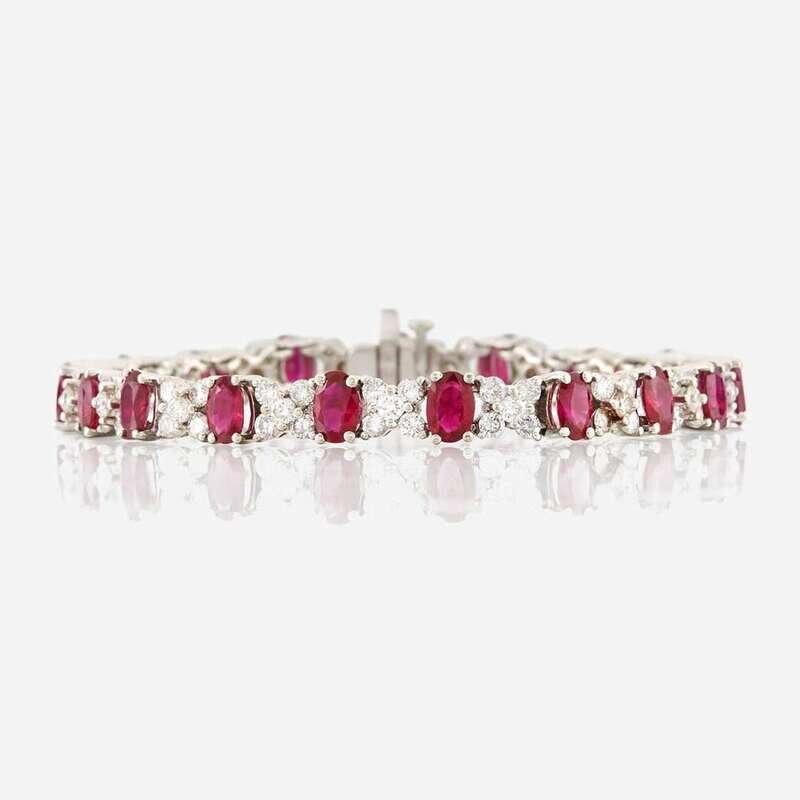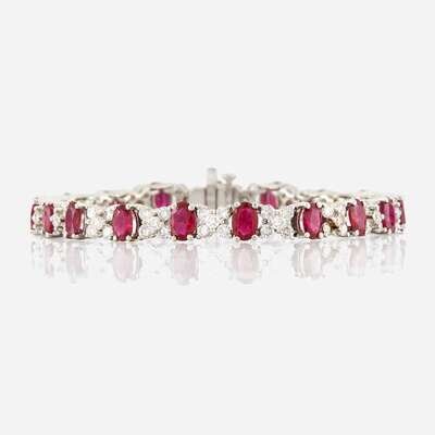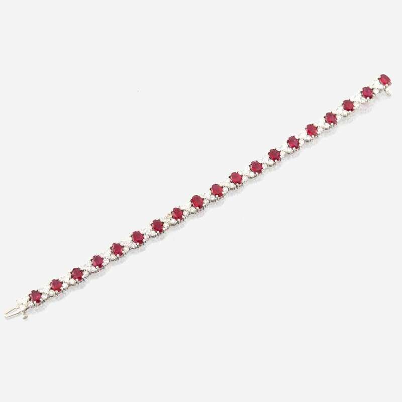 designed as oval-cut rubies alternating with round brilliant-cut diamonds in "X" pattern; estimated total ruby weight: 8.50 carats; estimated total diamond weight: 3.80 carats, mounted in 18K white gold.