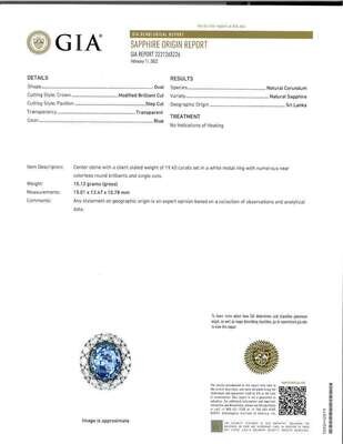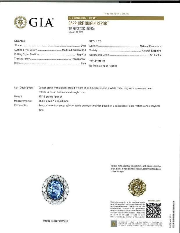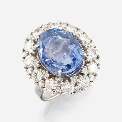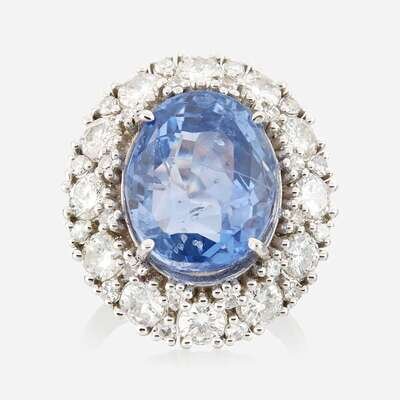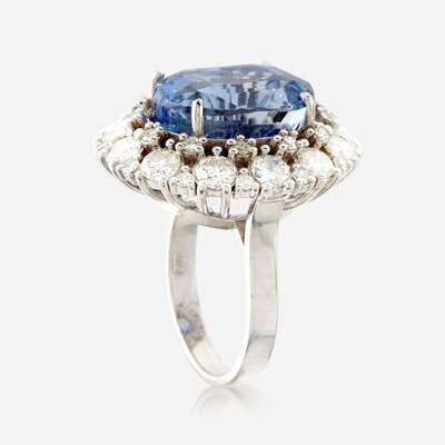 centering an oval-cut sapphire weighing approximately 19.40 carats, surrounded by round brilliant-cut diamonds; estimated total diamond weight: 2.65 carats, mounted in 18K white gold.