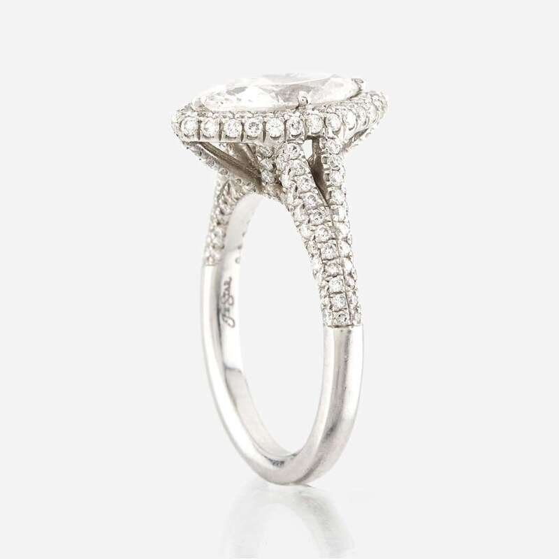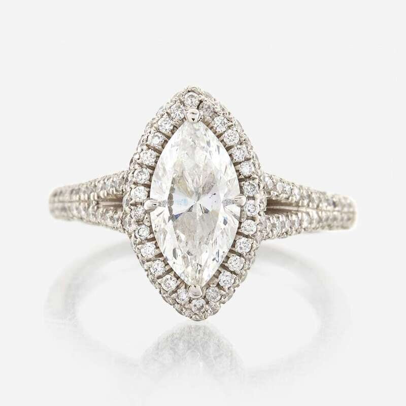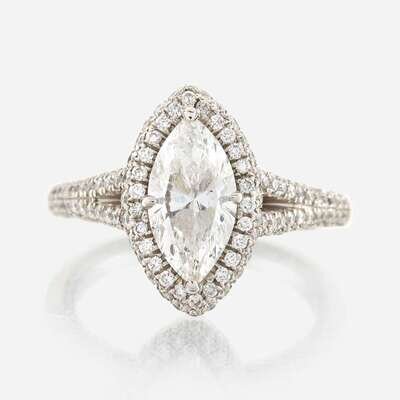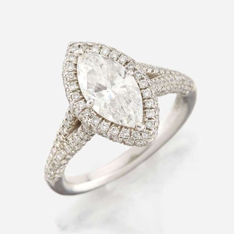 centering a marquise-cut diamond weighing 1.51 carat, surrounded and flanked by pavé-set round brilliant-cut diamonds; estimated total remaining diamond weight: 0.95 carat, mounted in platinum.