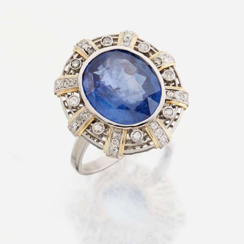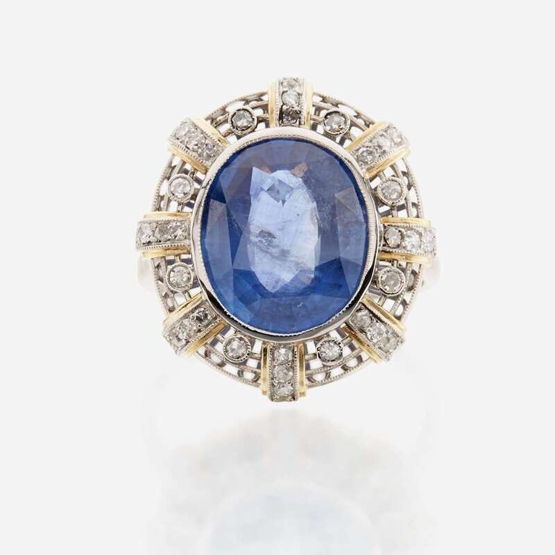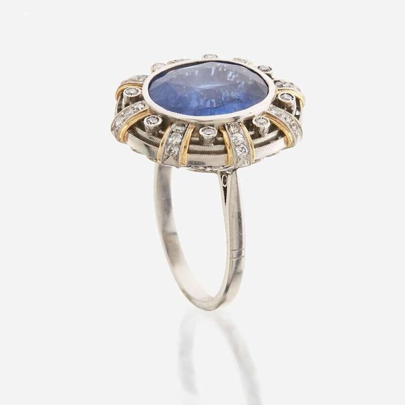 centering a bezel-set oval-cut sapphire weighing approximately 6.50 carats, surrounded by single-cut diamonds mounted in platinum with 18K gold accents, on open work setting.