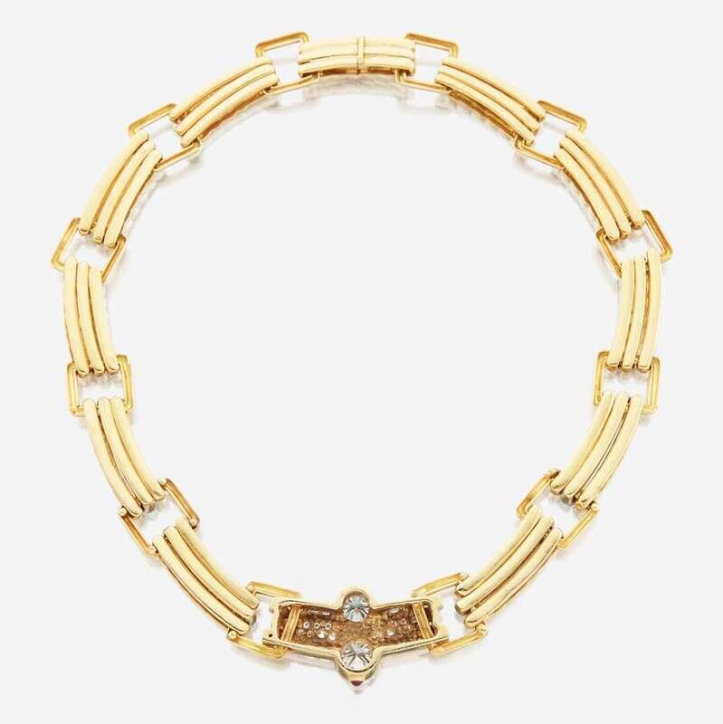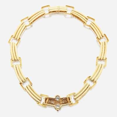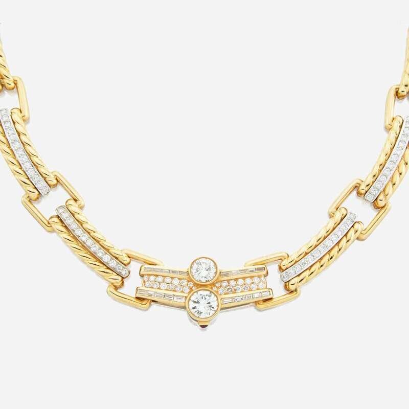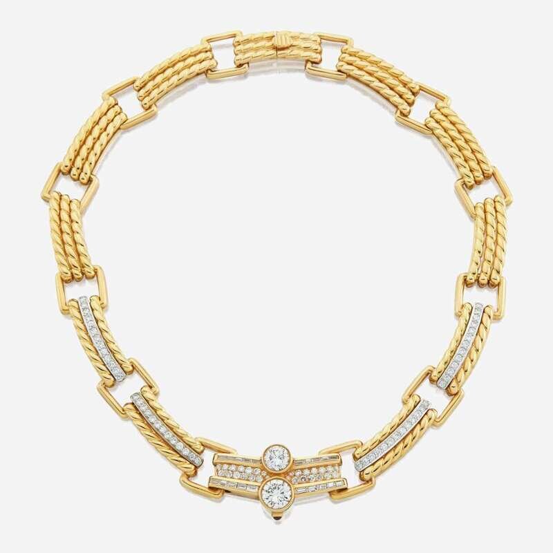 18K, designed as twelve rope textured connected links, the focal link contains two large diamonds, one approximately 2.00 carats and the second approximately 1.50 carats accented by marquise, round, and pavé-set diamonds, additionally four of the links are set with round brilliant-cut diamonds set east to west on the link; estimated total remaining diamond weight: 3.00 carats.