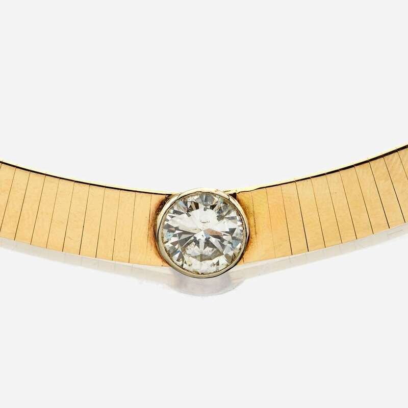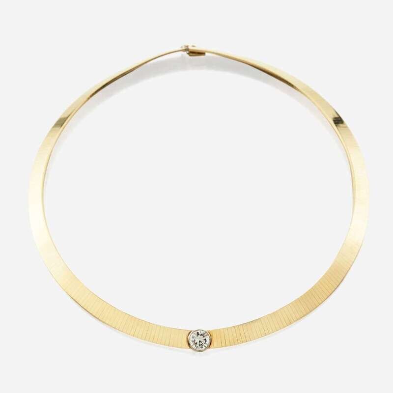 the polished 14K gold omega chain centering a bezel-set round brilliant-cut diamond weighing approximately 2.10 carats.