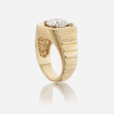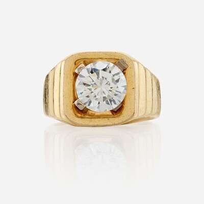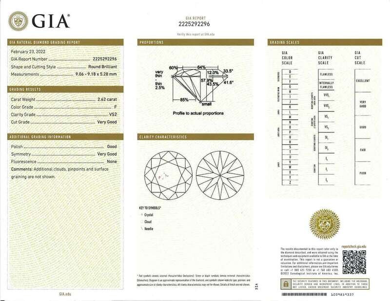 centering a round brilliant-cut diamond weighing 2.62 carats, set in tiered 14K gold mount.