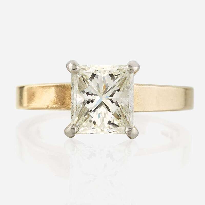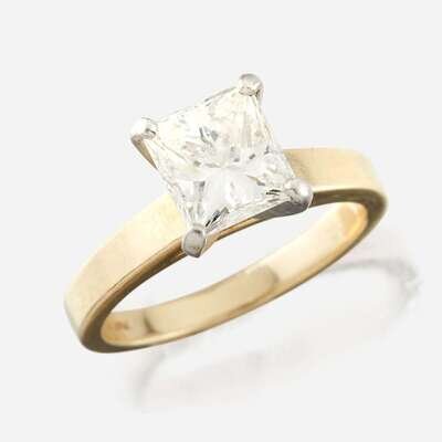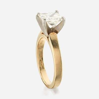 centering a rectangular brilliant-cut diamond weighing 2.30 carats, mounted in 14K white gold prongs, with 14K yellow gold shank.