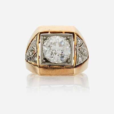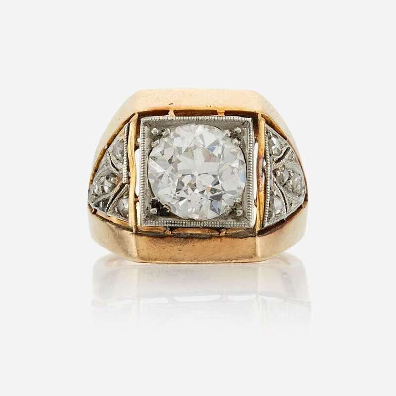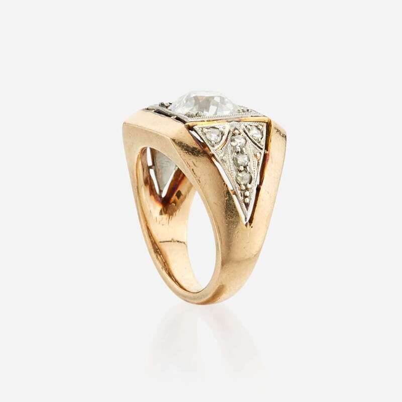 centering an old European-cut diamond weighing approximately 2.10 carats, flanked by rose-cut diamonds, set in millgrained platinum within 14K gold mount.