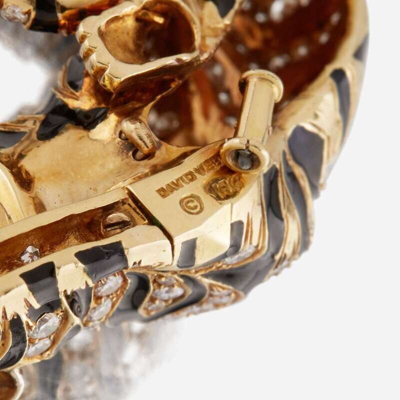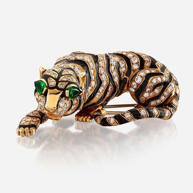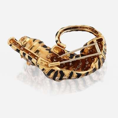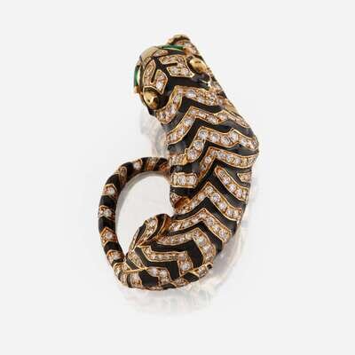 designed as an 18K gold tiger with articulating paw and tail, the stripes alternating black enamel and round brilliant-cut diamonds, and pear shaped emerald eyes; estimated total diamond weight: 4.85 carats.