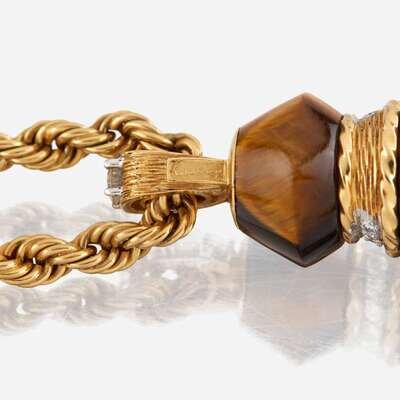 A gold, tiger's eye quartz, and diamond sautoir, Kutchinsky c. 1971