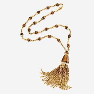 the necklace comprised of 18K gold rope chain and tiger's eye quartz beads, suspending an 18K gold rope tassel accented by tiger's eye quartz and round brilliant-cut diamonds; estimated total diamond weight: 1.50 carats.