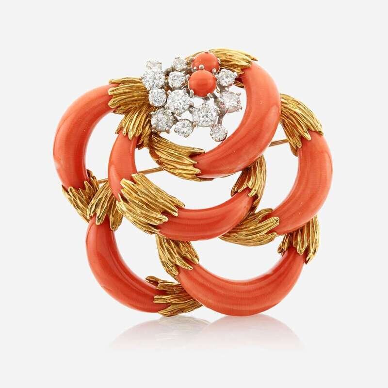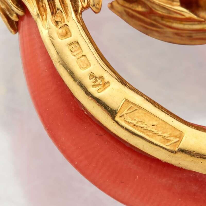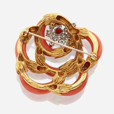 the openwork design comprised of textured 18K gold and carved coral rings, set with round brilliant-cut diamonds and coral cabochons; estimated total diamond weight: 1.70 carats.