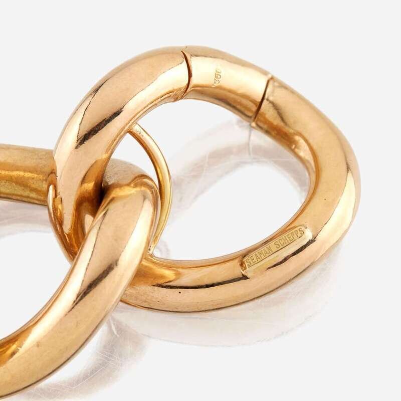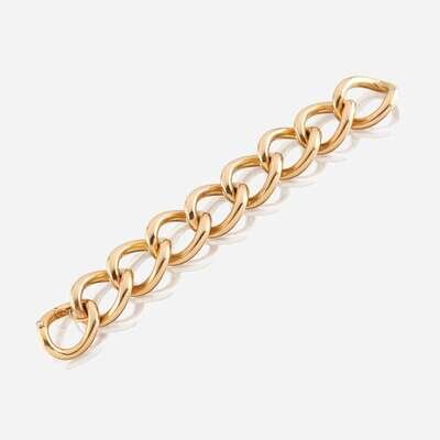 designed as large polished 18K gold curb links completed with a round brilliant-cut diamond-set clasp.