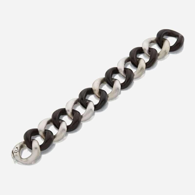 designed as alternating ebony wood and textured 18K gold curb links, hidden box clasp.