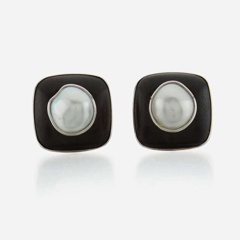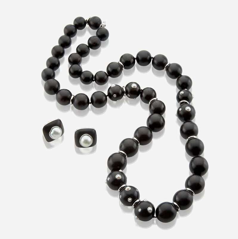the necklace is comprised of graduated ebony beads measuring approximately 17.00 to 14.00mm, seven of which are decorated by bezel-set pearls and brilliant-cut round diamonds, separated by flat 18K white gold beads; and a pair of matching earclips, centered by a freeform pearl.
