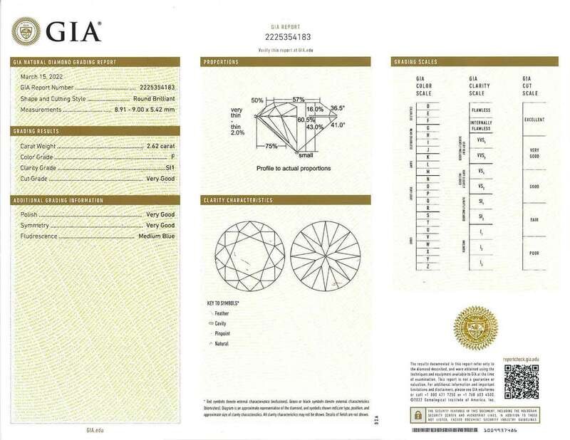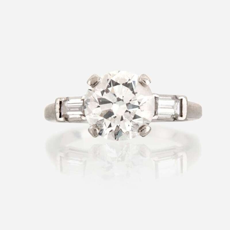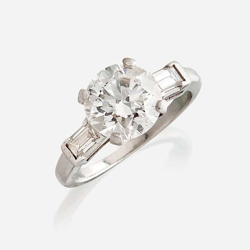 centering a round brilliant-cut diamond weighing 2.62 carats, flanked by straight baguette-cut diamonds, mounted in platinum.
