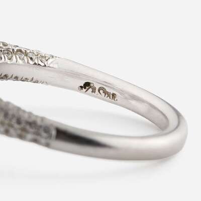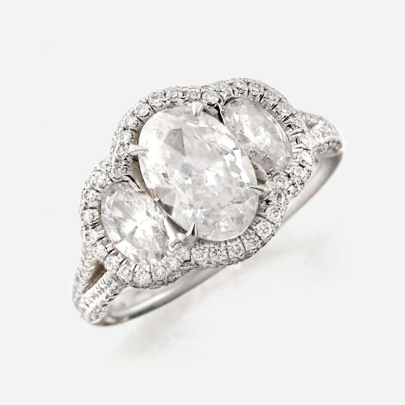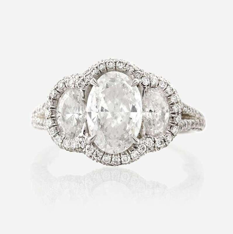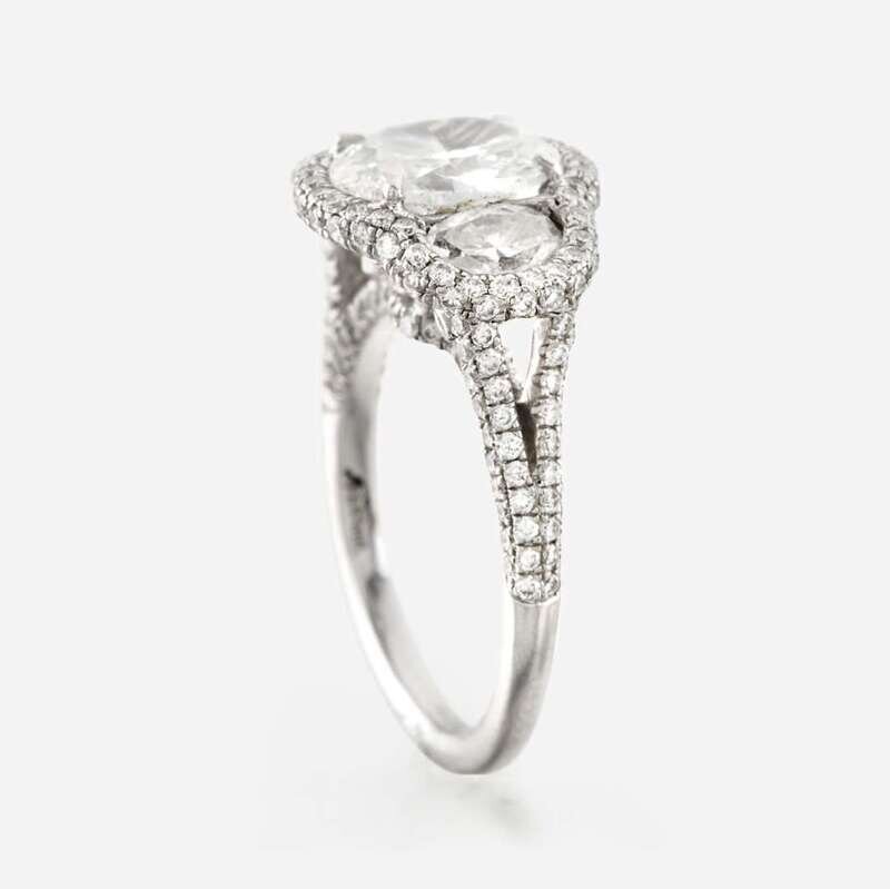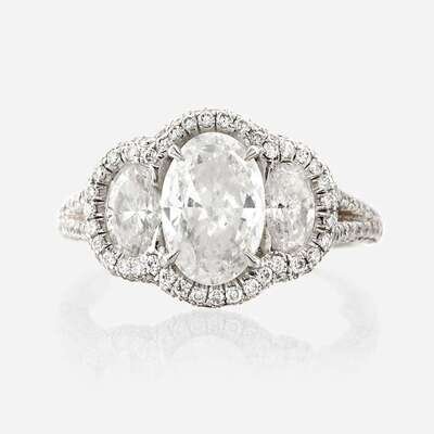 centering an oval-cut diamond weighing 1.52 carats, flanked by oval-cut diamonds weighing approximately 0.40 carat each, accented by round brilliant-cut diamonds; estimated total remaining diamond weight: 0.95 carat.