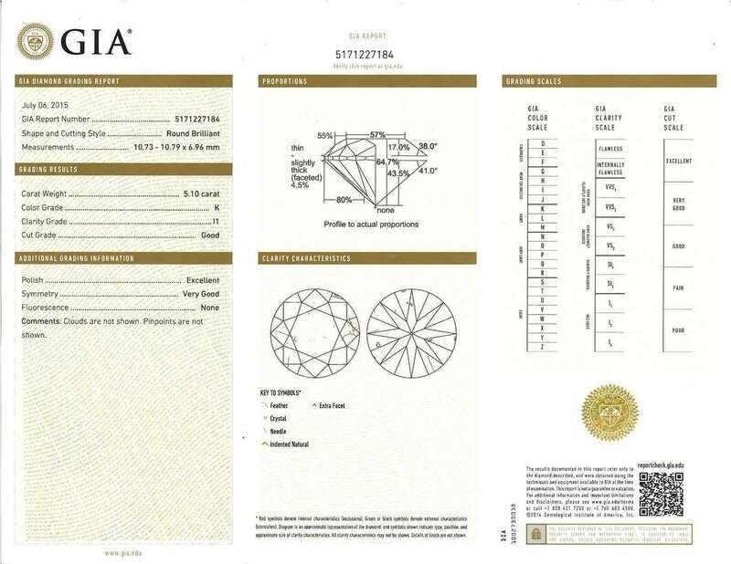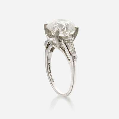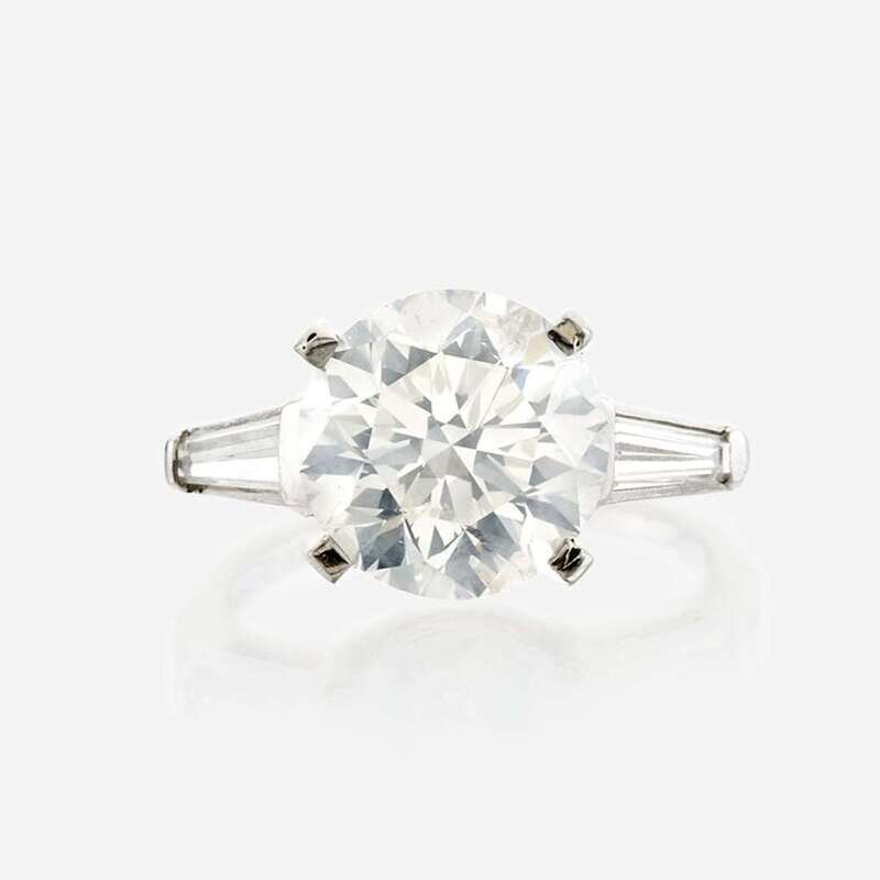 centering a round brilliant-cut diamond weighing 5.10 carats, flanked by tapered baguette-cut diamonds, mounted in platinum.