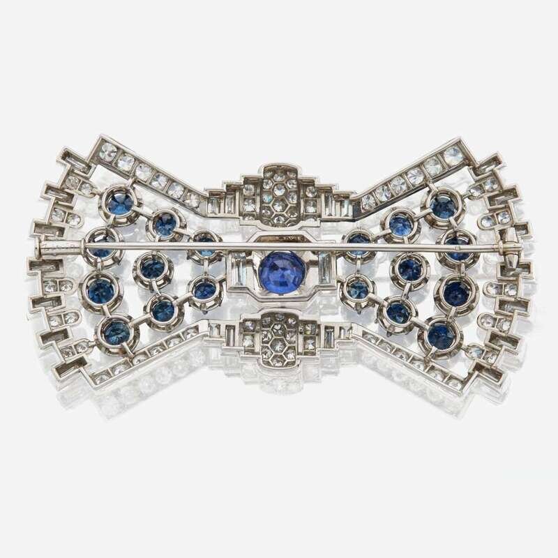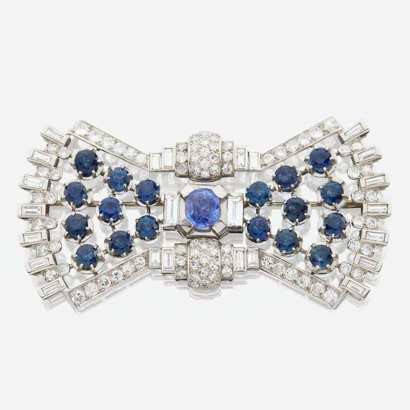 designed as a bow, centering a cushion-cut brilliant cut purple sapphire weighing 1.9 carats, accented by 18 round brilliant-cut blue sapphires and single cut diamonds, round brilliant diamonds, and baguette diamonds estimated weight of 6.0 carats
