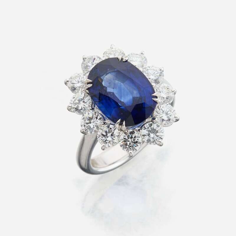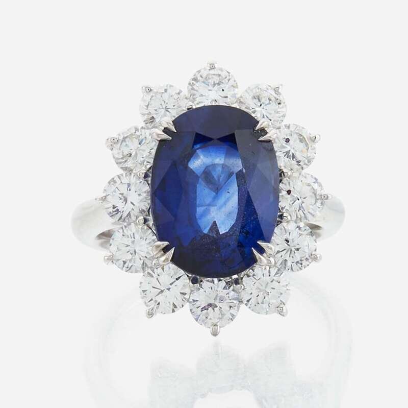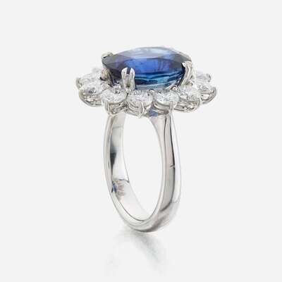 18K mounting, centering an oval-cut sapphire measuring approximately 12.4 x 9.25mm surrounded and flanked by 12 round brilliant-cut diamonds; estimated total diamond weight: 2.6 carats.